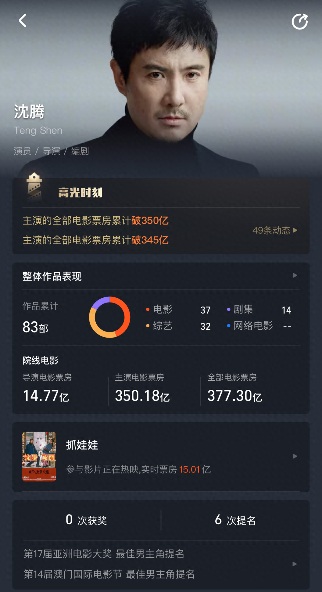 据灯塔专科版音尘,末端7月21日17:45,《执娃娃》上映6天,累计票房15亿,助力沈腾主演电影票房龙套350亿。沈腾亦然中国影史首位票房龙套350亿主演。