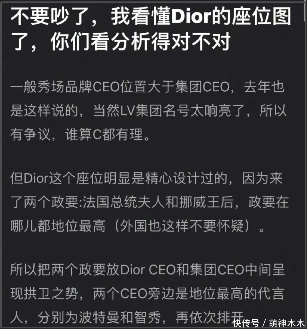 值得一提的是,有两位紧迫东谈主物出席了本次大秀,她们区别是挪威王后和法国总统夫东谈主。这么的话,那么C位毫无疑问即是这两位了,其他东谈主则成拱卫之势围绕着两位就座,两位CEO支配是地位最高的代言东谈主,区别是好意思国女演员娜塔莉·波特曼和韩星金智秀,之后再挨次排开。由此可见,在座位待遇上热巴依旧稍逊一筹。