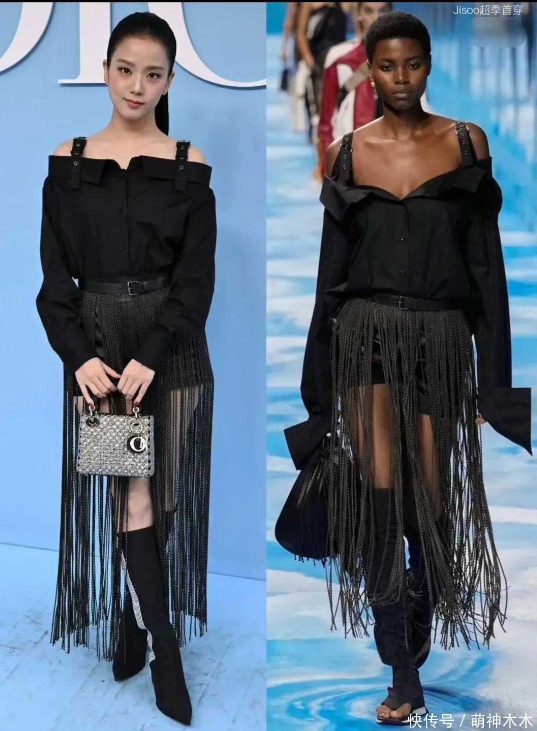 领先,是在服装上的诀别待遇。品牌方为热巴准备的看秀服装是该品牌发布的2025早春系列,另一边,品牌方为韩星金智秀准备的看秀服装却是未发布的2025年春夏系列,不仅是超季服装,也曾群众首穿。