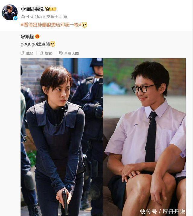 《乌云之上》官宣定档后,邓超晒出和孙俪的对比图,玩梗“gogogo启航喽”,为爱妻的新剧宣传。对此,孙俪职责室转发修起:“看得出孙俪很念念给邓超一枪。”