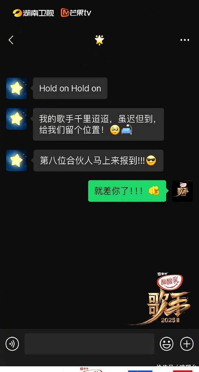聊天纪录里,一颗星星头像的“机密东说念主”还在说“Hold on Hold on,我的歌手沉迢迢,虽迟但到,给咱们留个位置!”。