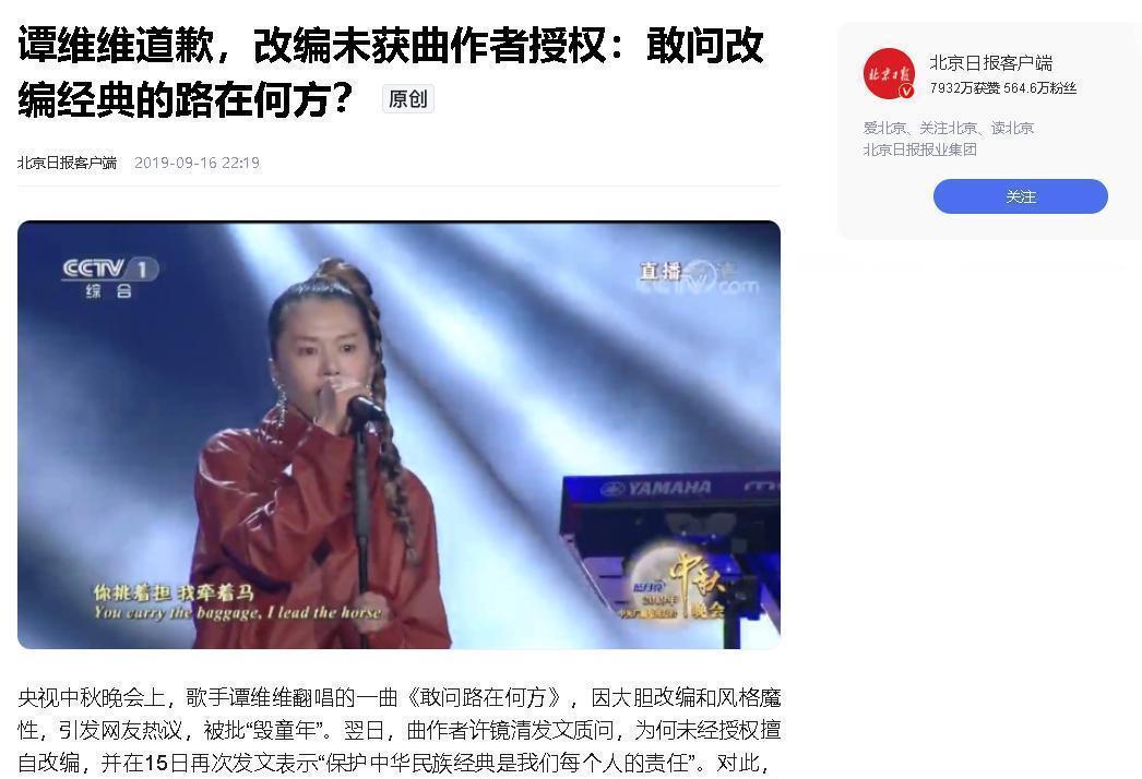 在央视中秋的晚会上,谭维维翻唱了《敢问路在何方》,何况斗胆对编曲进行了修改,那时在网上引起了不小的相关,许多网友以为谭维维这一改,便是“毁童年”。
