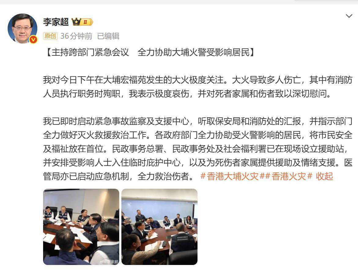 11月26日晚,香港尽头行政区行政主座李家超在微博发文:“我对当天下昼在大埔宏福苑发生的大火尽头温雅。大火导致多东说念主伤一火,其中有消防东说念主员试验职务时殉职,我默示尽头哀伤,并对死者家属和伤者致以潜入慰问。”