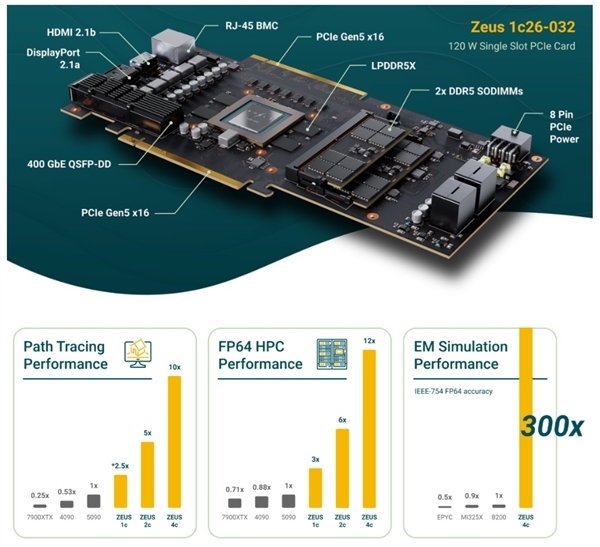 ZEUS显卡举座上是使用他们自研的SIMD架构,由RISC-V中枢的处理器松手,原型卡摄取PCIe 5.0 x16插槽,LPDDR5X算作内存(显存),况兼是不错延迟至极的DDR5插槽。