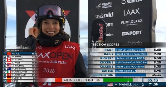 直到12月初,谷爱凌才收货了新赛季首冠。在雪盟滑雪联赛目田式滑雪U型花样手段赛中,谷爱凌先打败了加拿大名将凯西·夏普,随后在半决赛和决赛平区别校服队友李方慧与张可欣,夺得冠军。