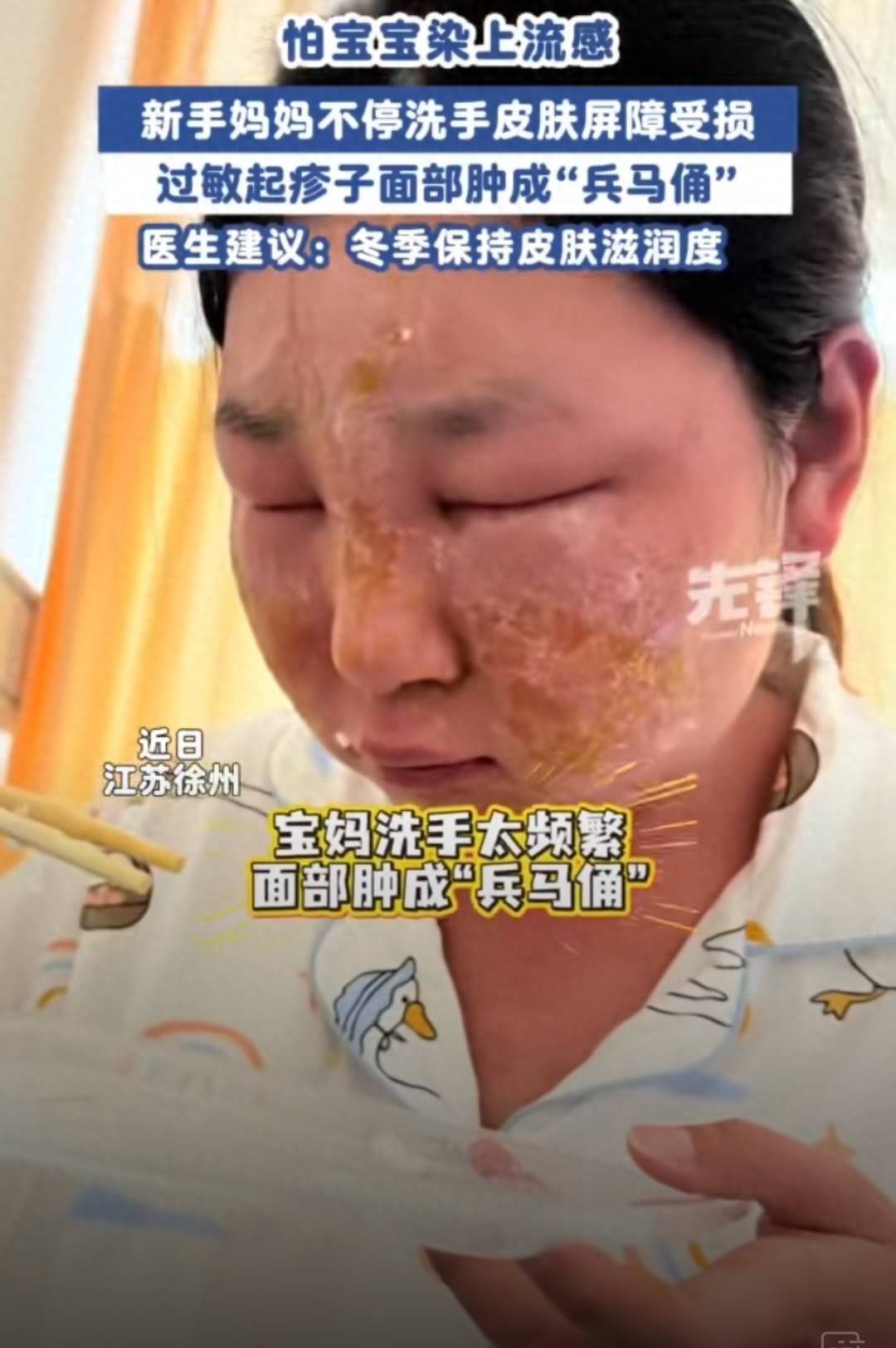 近日,江苏。生手宝妈因追思流感传染给宝宝,每天反复洗手消毒,连护肤品皆不敢用,最终导致双手、全脸乃至全身起疹,面部红肿变形。其丈夫何先生示意,老婆遭逢非婴儿用品就坐窝洗手,湿疹从手部彭胀至全身仅用了2天,当今已在南京入院诊治。经检查,放弃感染,确诊为因过度清洁导致皮肤樊篱严重受损激发的过敏性皮炎,经诊治已徐徐好转。