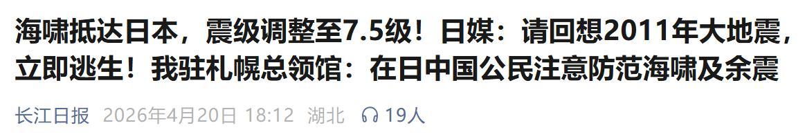 长江日报《海啸抵达日本,震级转移至7.5级!日媒:请纪念2011年地面震,立即逃生!我驻札幌总领馆:在日中国公民抽象防患海啸及余震》